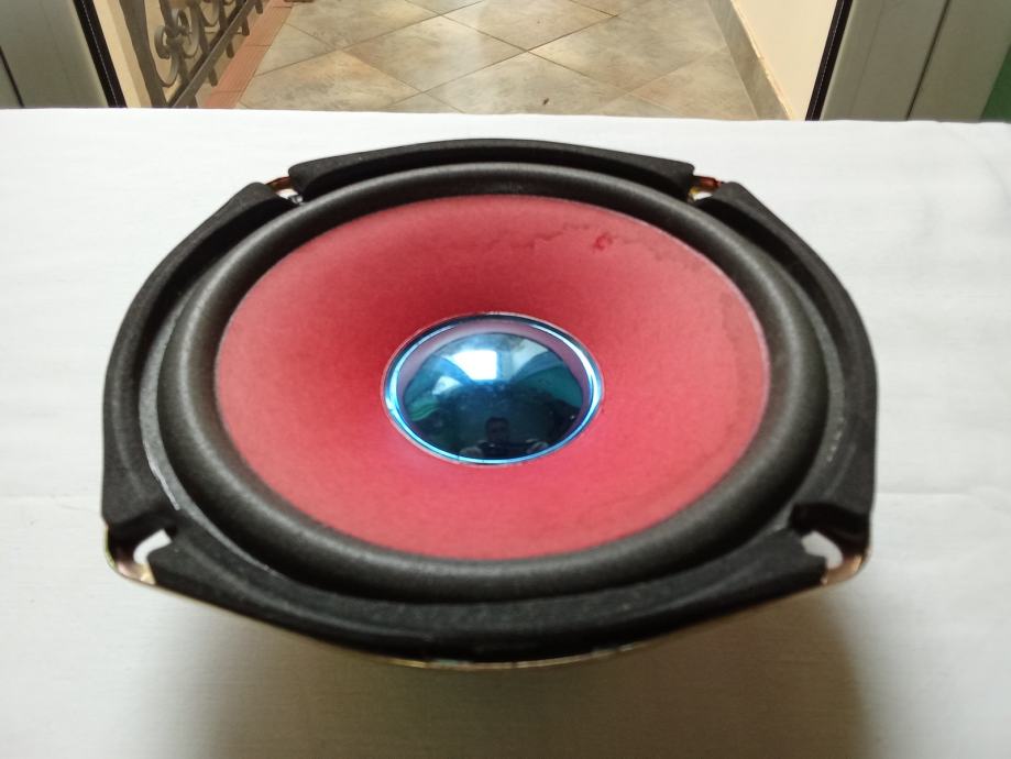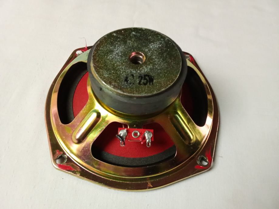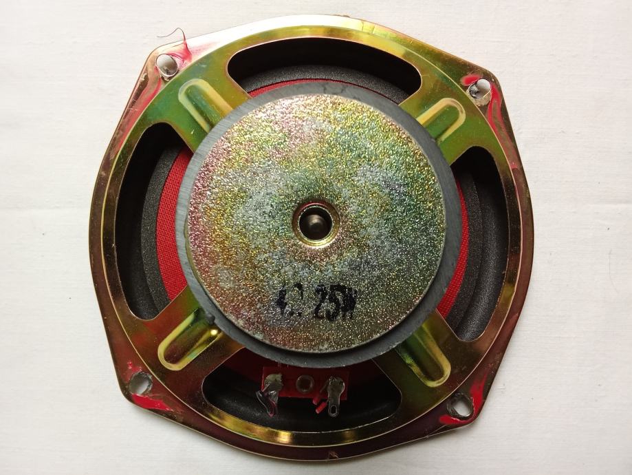 Prodajem samo jedan 5.5-inčni potpuno ispravan i neoštećen bas zvučnik, neidentificiranog proizvođača i modela. Njegova maksimalna snaga je 25 W, pri otporu 4 Ohma. Vanjski promjer ovjesa je 138 mm, vanjski promjer metalnog obruča košare 155 (u predjelima gdje je najuži), dubina ugradnje 56 mm, a promjer rupe na kutiji treba biti 145 mm. Masa predmeta je 500 grama.