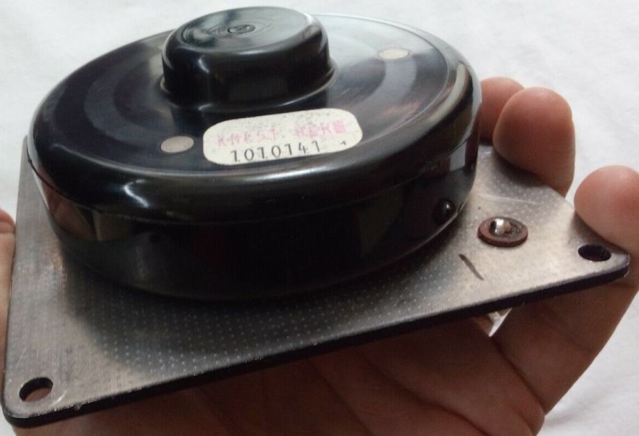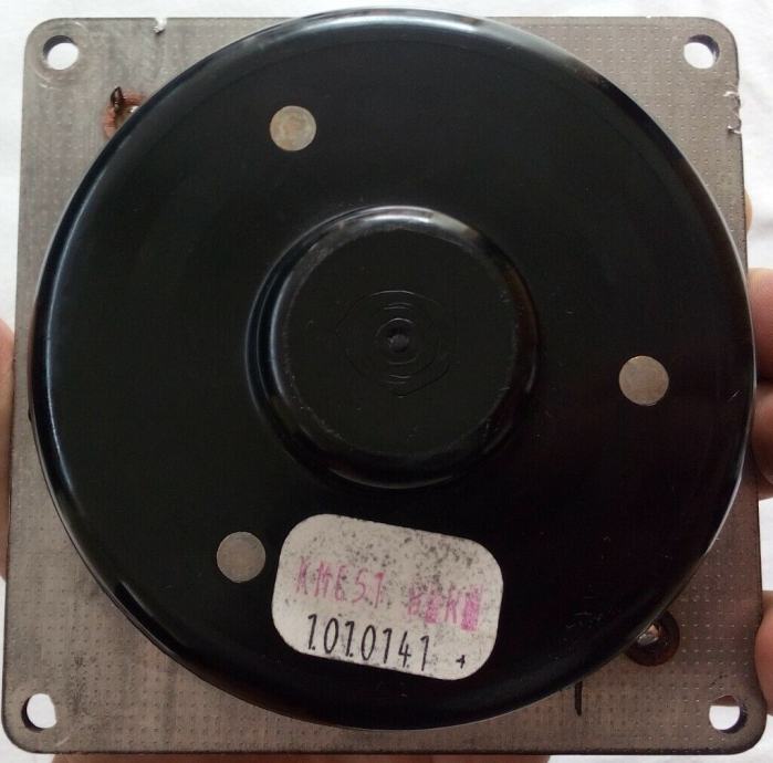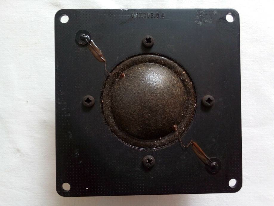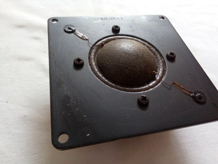 Ispravan visokotonac, provjeren slušanjem glazbe kroz njega i mjerenjem otpora multimetrom, koji pokazuje 6.3 Ohma. Promjer dijafragme je 63 mm (2.5 inča), promjer magneta 106 mm, a duljina stranica kvadratnog okvira 125 mm.