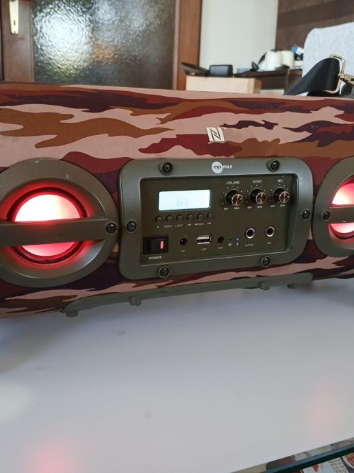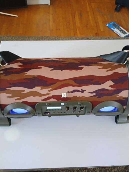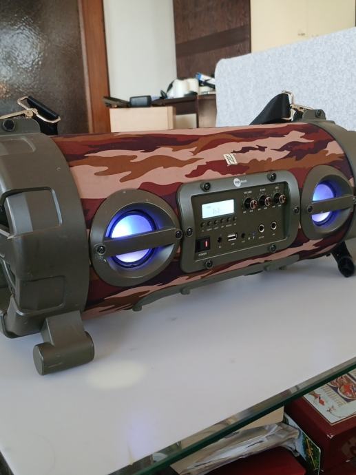 Bloutooth zvucnik prodajem za 40 eura. Ugradjena su svjetla u bojama koja trepere u ritmu muzike. Ima usb, radio, aux i kabel za nosenje