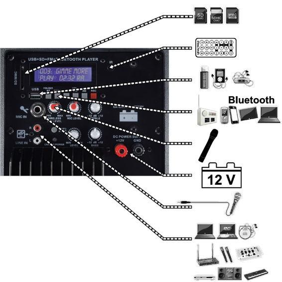 Zvučnik,set, mikrofon,pojačalo,daljinski upr,12V/baterija. Multimedijalni zvučnici sa ugrađenom baterijom, odličan Hi-Fi kvalitet zvuka, kontrolni mikser pojačalo visokih tonova i basova, EQ, MP3 / WMA player sa LCD zaslonom, daljinski upravljač za MP3 player, utor za SD / SDHC / MMC, FM radio sa automatskom pretragom radiskih stanica, Bluetooth konekcija do max 10 met. Sučelje USB, SD , MIC, Bežični MIC. Masivna konstrukcija . Tri vrste napajanja, ugrađena baterija vanjska baterija 12V, napajanje za mikrofon 9V. Pribor , bežični mikrofon , daljinski upravljač, napojni kabel.