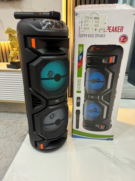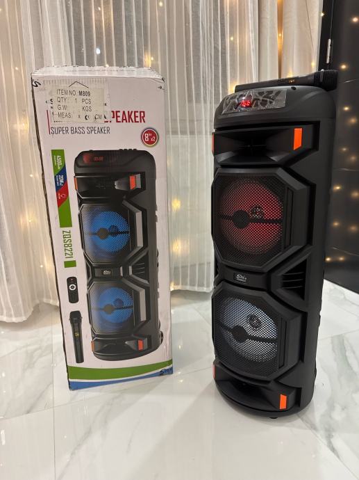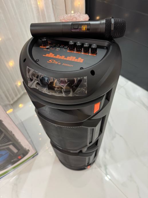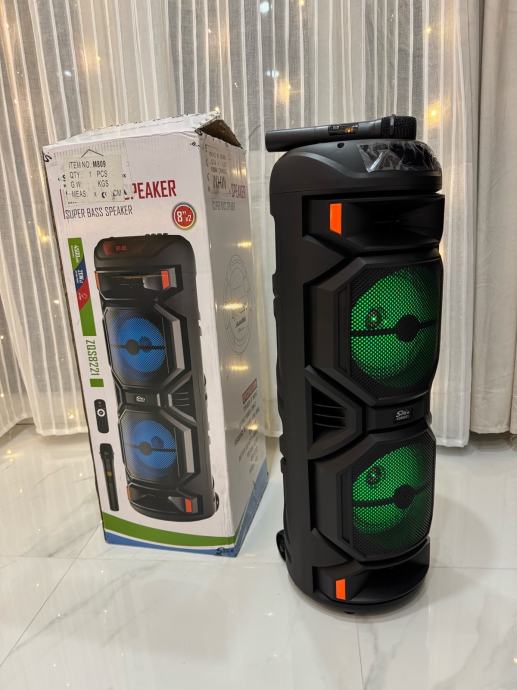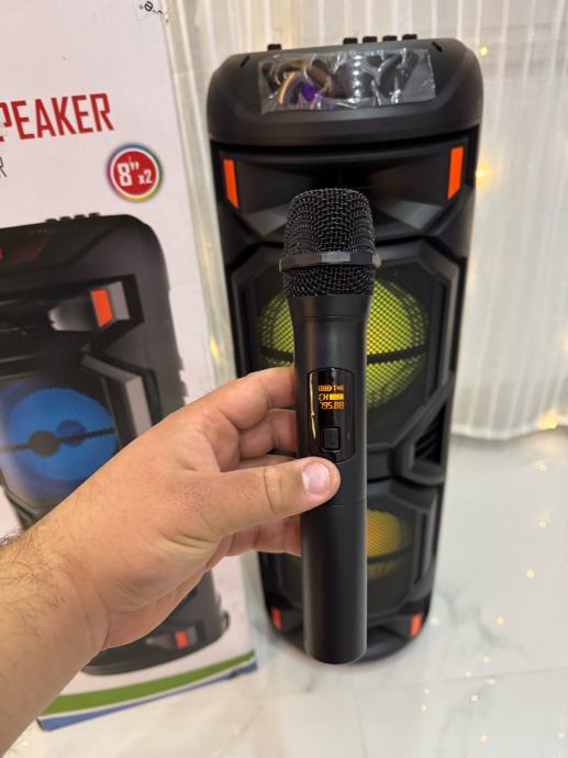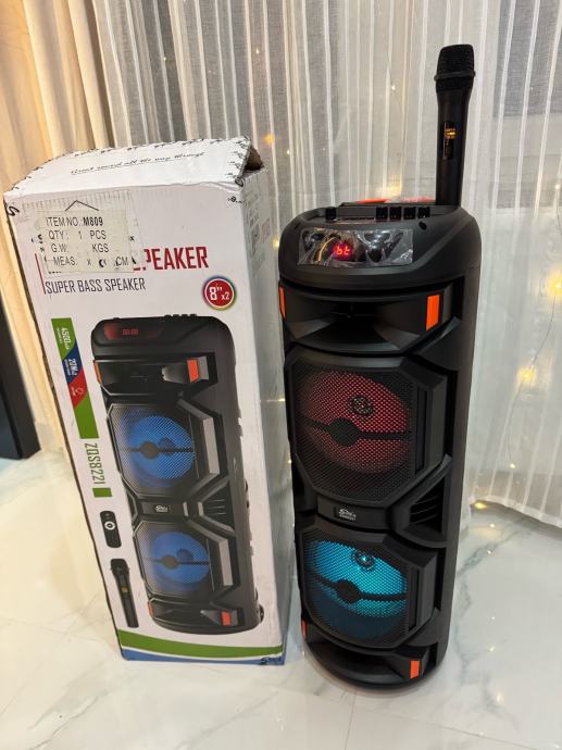 Prodajem potpuno novi Bluetooth karaoke zvučnik s dvostrukim 8-inčnim driverima za snažan zvuk. Dolazi s bežičnim mikrofonom idealnim za kućne zabave i karaoke druženja. Zvučnik nudi super bass kvalitetu zvuka i atraktivan dizajn s LED osvjetljenjem koje stvara dodatni ugođaj.