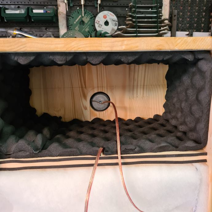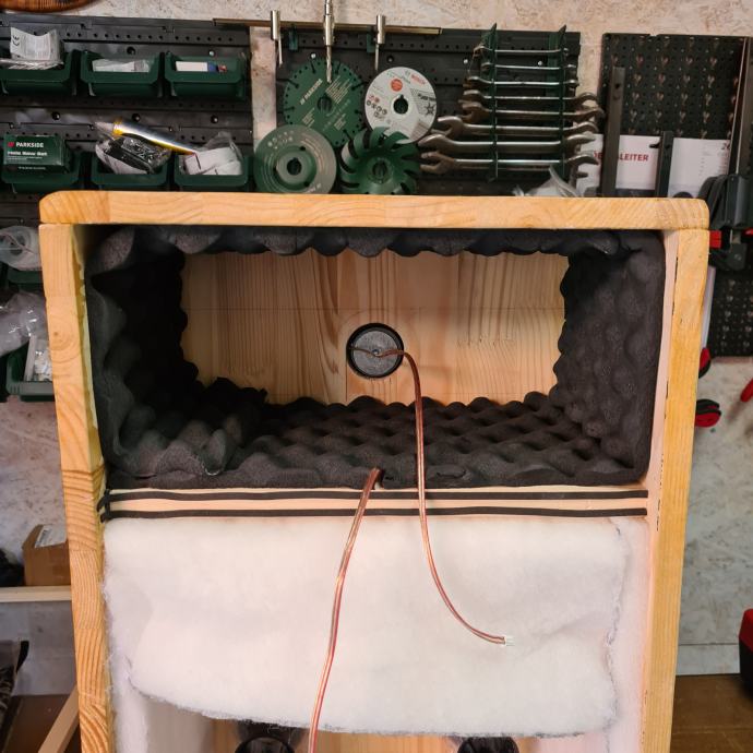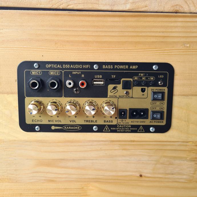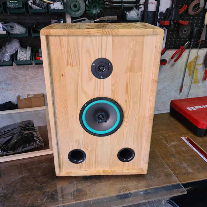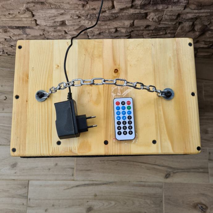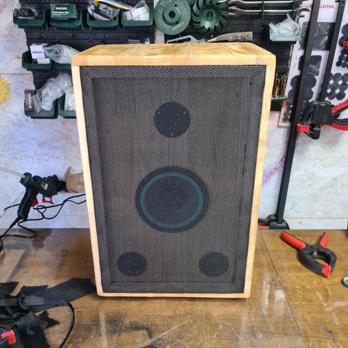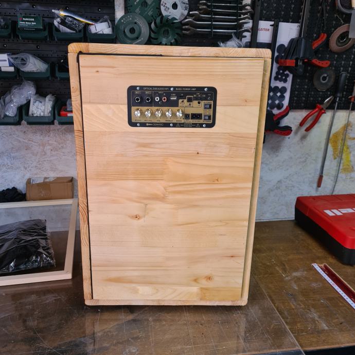Prodajem bluetooth zvučnik za karaoke partije ručni rad.Kutija rađena oj ljepljenih ploča drveta jele.ima dva zvučnika dvosistemski bas i srednj i jedan visokotonac.ploča s pojačalom oko 50 wata.dva otvora za bas refleks i zaštitnom mrežicom.U zvučnik je stavljena zvučna izolacija (dampiranje).