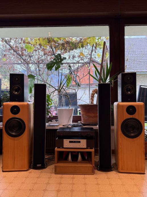 Prodam ali menjam zelo dobro ohranjene, samostoječe zvočnike stare 40 let, ki so primerni tudi za večje prostore. Globok, hiter in natančen bas, izredna zvočna slika. Zračne tuljave in visokokakovostni kondenzatorji, 6dB/oct. Zelo masivno ohišje, stranice so debele 40 mm, Variovent na zadnji stranici. Pravi furnir in masiva Jelka.
