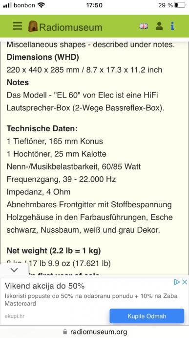 Elac EL 60 Germany Vintage zvučnici 4 Ohma / 8 kg / kom 60/85 Watt