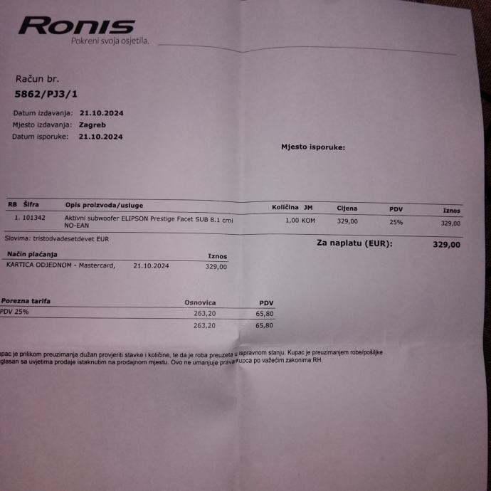 kupljen 21.10.2024 g. u Ronisu ,račun i 2g. garancije, stanje kao i kad je kupljen sve je 10/10.