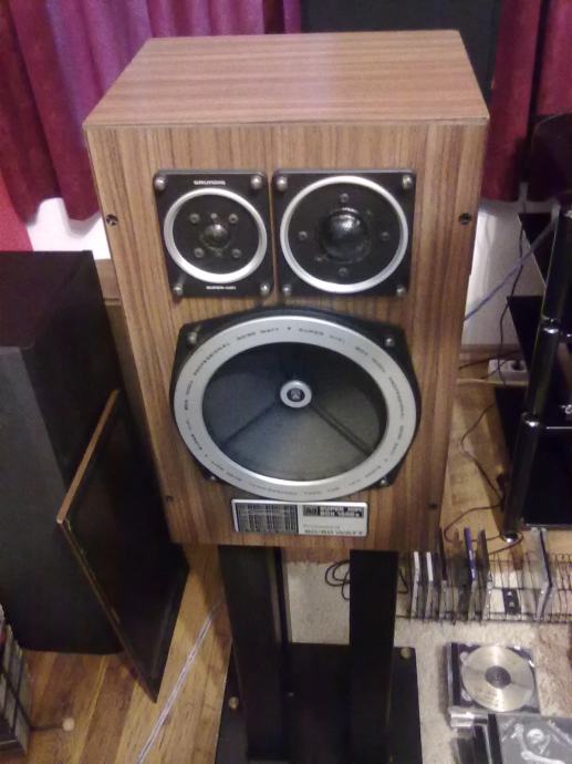 Jedni od najboljih Grundigovih zvučnika iz zlatnog doba. Vrlo očuvani, besprijekorno rade, trosistemci, vrhunski zvuk, čist, detaljan, ugodan, svirali na Pathos-u classic uz Diapason Adamantese. Dolaze u kompletu s masivnim stalcima svaki preko 20 kg i originalnim Grunding zvučničkim bakrenim kablovima. I veliku sobu napune zvukom. Široka i duboka pozornica. Mnoge popularne kutije kraj njih zvuče kao igračke. Moguće slušanje u mojoj slušaoni bez obaveze na kupovinu.