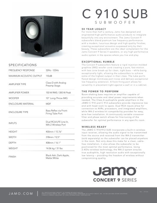 Više od pola stoljeća Jamo je dizajnirao i projektirao audio proizvode visokih performansi kako bi se lijepo integrirao u svako okruženje. Subwooferi Jamo Concert 9 spajaju vrhunske niskofrekventne performanse s modernim, luksuznim dizajnom i visokokvalitetnom završnom obradom, stvarajući iznimnu akustiku koju nadmašuje samo njihova ljepota. Ovi subwooferi idealna su nadopuna zvučnicima Jamo Concert 9 Series II ili bilo kojem audio sustavu visokih performansi u prostorima u kojima živite i igrate.