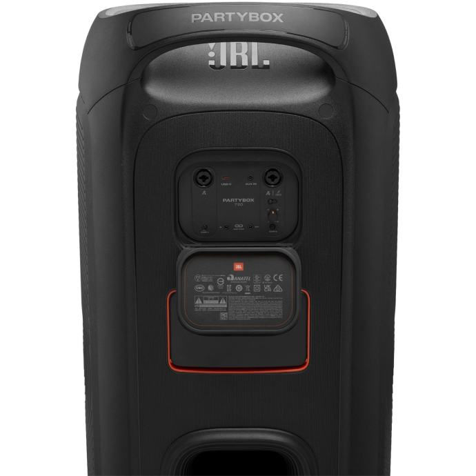 Donosimo vrhunsku party energiju kamo god idemo s JBL PartyBox 720. Superiorni JBL Pro zvuk, duboki precizni bas koji pogađa kako treba i svjetlosni šou koji ide u potpunosti – zvjezdana svjetla, tekući tragovi i pulsirajući stroboskopi. Možda je velik ali napravljen je za kotrljanje s udobnom ručkom, glatkim širokim kotačima i dizajnom otpornim na prskanje koji može podnijeti malu akciju uz bazen. Zamjenjive baterije (prodaju se zasebno) daju nam do 15 sati reprodukcije — savršeno za zabave izvan mreže. Zamijenite novu bateriju i održite glazbu živom. Možemo stereo upariti dva 720 ili bežično povezati više JBL Auracast™ zvučnika za još više zvuka. Bilo da streamamo, pjevamo karaoke ili priključujemo mikrofone i opremu, USB priključak i dvostruki XLR ulazi pokrivaju nas.