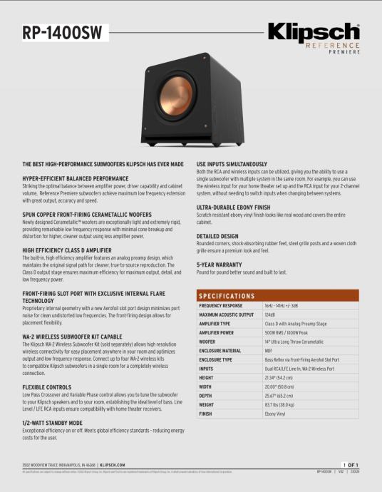 Klipsch RP-1400SW opremljen je keramičkim wooferom ultra dugog dometa od 14 inča i snažnim pojačalom Class-D s vršnom snagom od 500 W RMS / 1000 W. Opasnost od potresa! – Dimenzije (VxŠxD): 54.28 x 50.8 x 65,2 cm, težina: 38.0 kg, maksimalni zvučni tlak: 123 dB