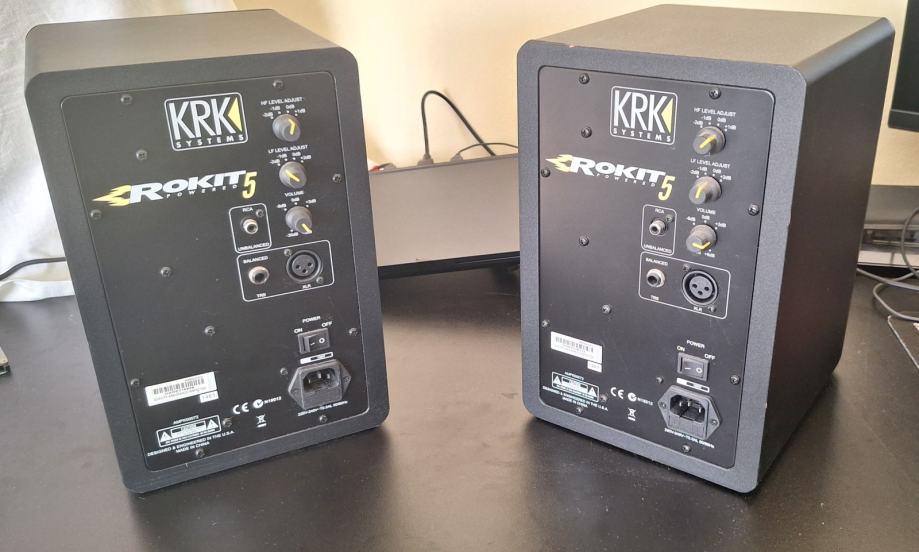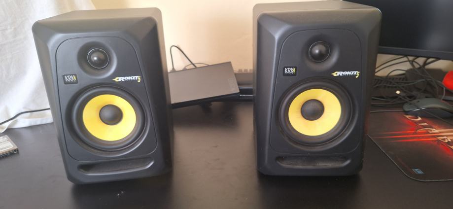 Prodaju se dva studijska KRK monitora generacije 5 "Powered" edition. Uz njih dolazi eksterna zvučna kartica Tascam US-322 te pripadajući napajački, audio te komunikacijski kabeli.