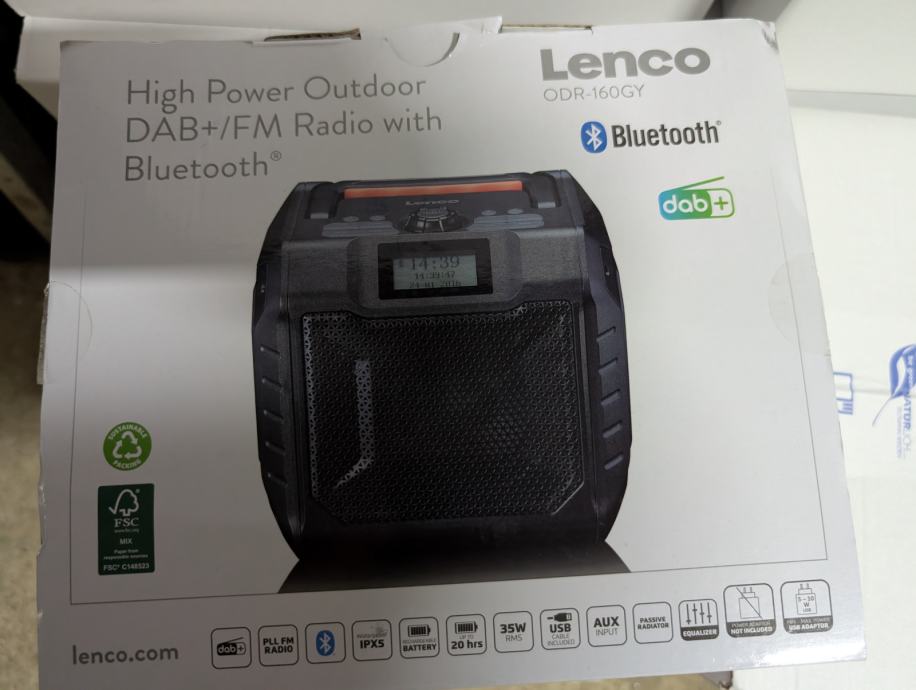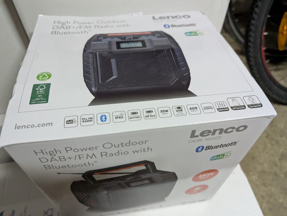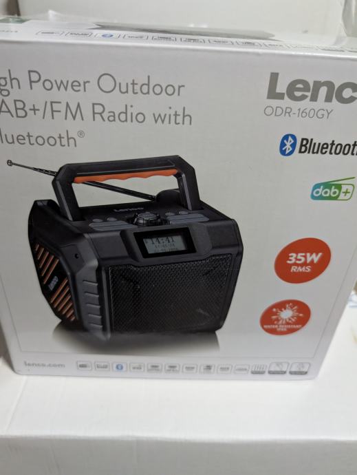 Lenco ODR-160GY je snažan prijenosni Bluetooth® DAB+/FM radio s ugrađenom punjivom baterijom koja nudi do 20 sati trajanja baterije. Radio je vodootporan prema IPX5 standardu i ima robustan dizajn, zbog čega je savršeno prikladan kao gradilišni ili vanjski radio. Radio se može lako nositi bilo gdje pomoću ručke za nošenje na vrhu ODR-160GY. Osim toga, radio ima funkciju powerbanka, pasivni bas radijator, integrirani ekvilajzer i funkciju alarma. Bez obzira jeste li u zatvorenom ili na otvorenom - s ovim robusnim radiom uvijek ćete trebati snažan zvuk i maksimalnu jednostavnost korištenja. Iskusite udobnost i svestranost ODR-160GY, snažnog nasljednika popularnog ODR-150GY s poboljšanim funkcijama!