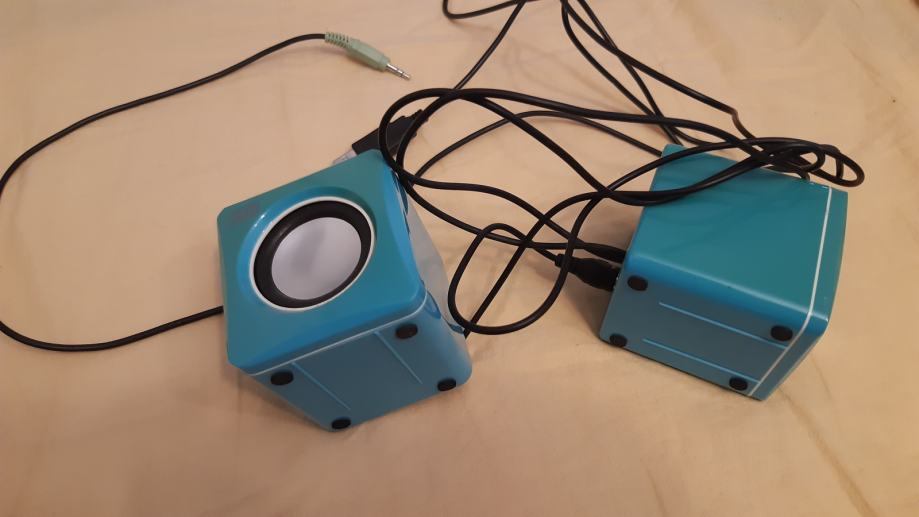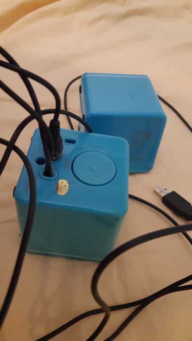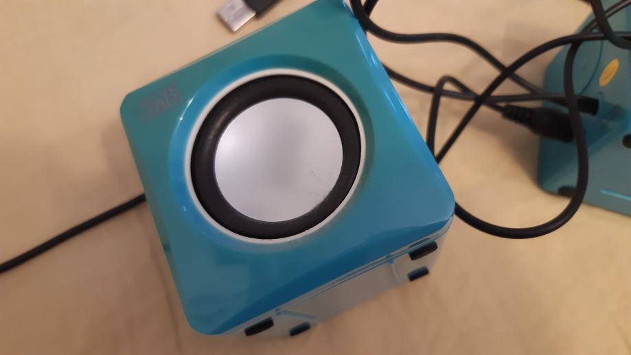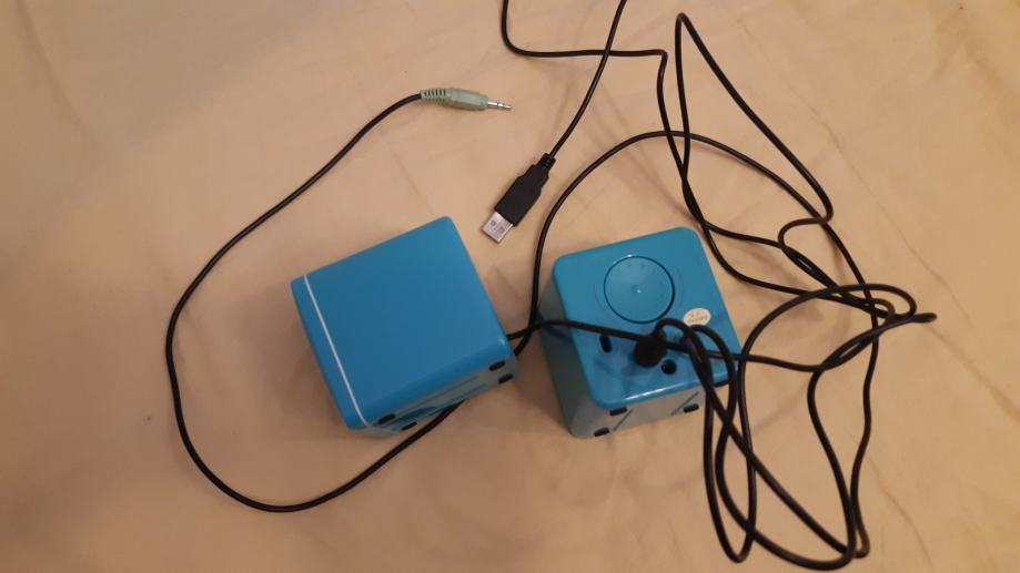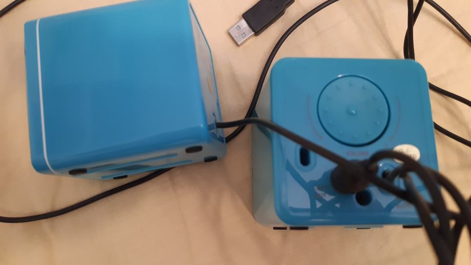 Mali plavi zvučnici s regulacijom glasnoće 7x7x7 cm
