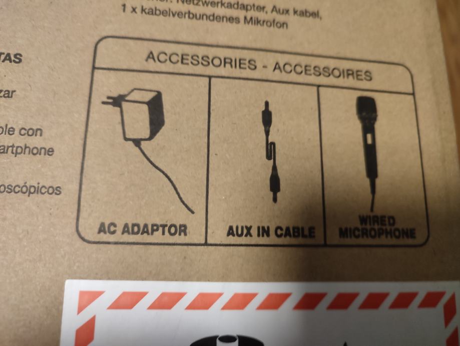 Dodaci: 1× žični mikrofon, Aux in kabel (3,5 mm), AC adapter