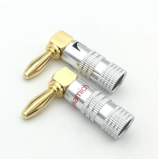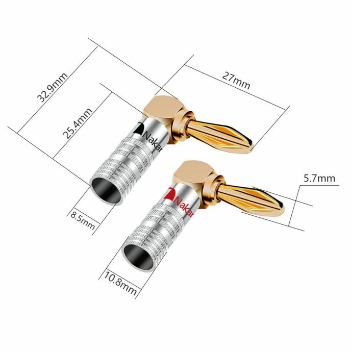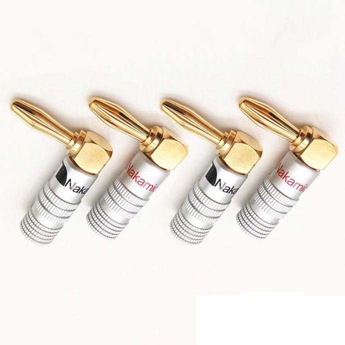 Nakamichi zvučnički konektori (4 mm banana, 90°). Konektori su pozlaćeni s 24 karatnim zlatom, potpuno novi. Posebno prikladni u slučaju da je veoma malo prostora iza zvučnika (npr za bookshelf zvučnike smještene u policama).