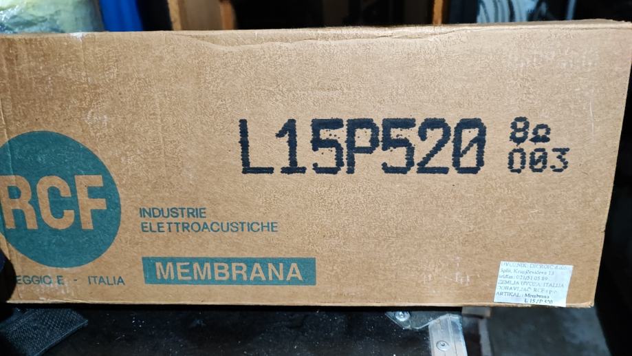 Prodajem dva zvučnika RCF L 15-520 . Jedan zvučnik je ispravan kao novi u originalnom stanju a drugi je neispravan oštećen ovjes i zavojnica. Cjena za oba ispravan i neispravan je 130 eura. Za neispravan zvučnik imam originalni novi recon kit (membranu) koji košta 120eura. Mogu zamjeniti novu membranu na zvučniku. U tom slučaju cjena je 220 eura za oba zvučnika .