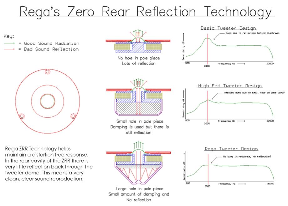 High Frequency unit The RS3 uses our new HF20-ZRR high frequency unit which is uniquely designed by Rega. By removing unwanted rear reflection the design of the ZRR tweeter helps maintain a distortion free response. Sound and set-up The drive units in the RS3 have been designed with great care. The crossover needs no additional filter networks to work with the drive units. Unlike most manufacturers who boast about the complexity of their crossovers, Rega are proud of simplicity. Rega believes that bi-wiring will offer no advantage to the crossover. The RS3 also has a front firing port allowing them to be placed against a wall, without Bass lift, if required. The RS3 side firing system gives easy positioning of the loudspeakers in most rooms. However depending on the room environments, this system can offer improved sound stage/dynamics and also allows the RS range of speakers to cope well in difficult rooms.