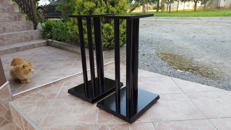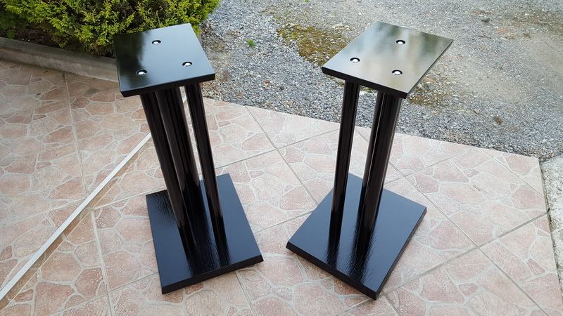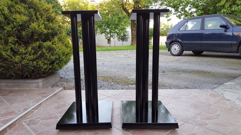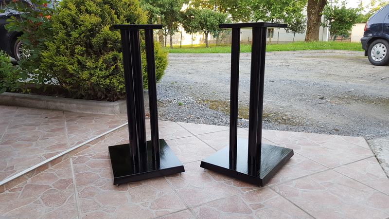 Novi stalci za zvučnike, visine 60cm, šiljci(inox/krom). Izrada : donja(220x270mm) i gornja ploha(150x180mm) MDF debljine 32 i 16mm, cijevi 1x60mm i 2x35mm. Finiš sjajni crni lak , mogućnost punjenja. Moguće razne varijacije u bojama, oblicima ploha, broja cijevi, visina, itd.