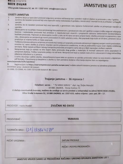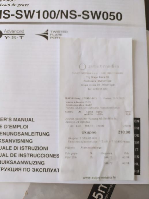 Prodajem aktivni subwoofer 'Yamaha NS-SW050'. Kao nov, star 1 god. Neoštećen. Još je pod garancijom (račun). Originalna kutija pakovanja. Cijena 150,00 EUR.