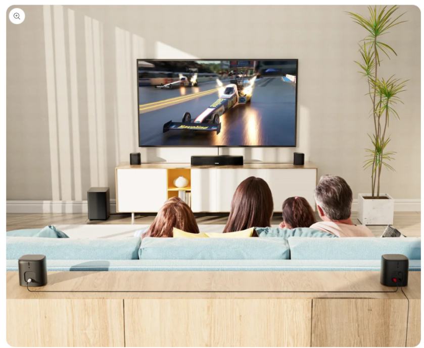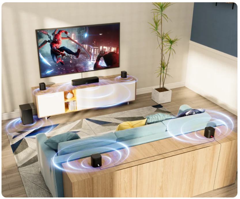 Soundbar Aura A40 za TV ima 2 žična prednja i 2 žična stražnja surround zvučnika, što omogućuje precizno usmjeravanje zvuka sprijeda i straga, uz bolju prostornu dubinu i doživljaj. Sa 13 prilagodljivih razina surrounda, stražnji zvučnici i soundbar povezuju se bežično, smanjujući broj kabela i optimizirajući prostor.