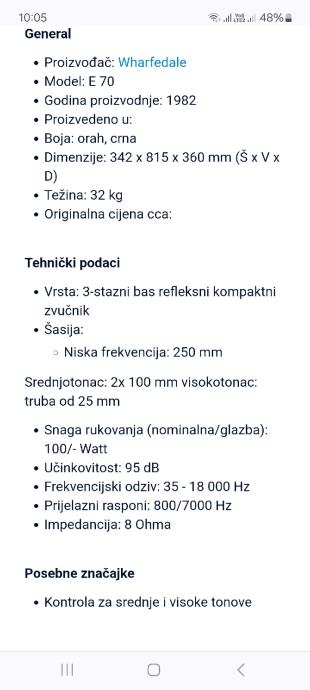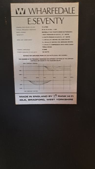 Prodajem zvucnike Wharfedale E70. Zvucnici su visoke osjetlivosti (95db) tako da su podatni za pojacala manjih snaga kao i lampaska pojacala. Impedanca je 8 ohm, a nominalna snaga 100 W. Teski su 34 kg svaki ,a nalaze se na izradjenim stalcima tako da su poviseni za nekih 30-tak centimetara. Izmedju stalaka i zvucnika nalazi se sloj gume radi anuliranja vibracija. Za sve detalje slobodno me kontaktirajte.