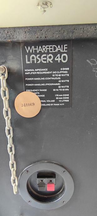 WHARFEDALE Laser 40, Vintage zvučnici, ispravni, 6 OHM, 45W, 58-22.000 HZ, Bas 170 mm,Treble 50 mm. Kutija 13 litara , Dimenzije 35x24x24 13 litara, Kompresiski, Made in England. Cijena 70 €, Bez zamjena.