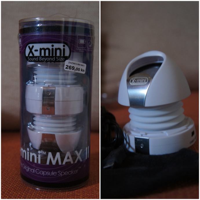 X-mini MAX 2 cuvani, svirani samo u kuci, kompaktni, sa vrećicom od platna za nosenje, sa originalnom kutijom, razlog prodaje: imam jos jedan identican zvucnik -200 kn-placeni 269 kn------> PRODANO