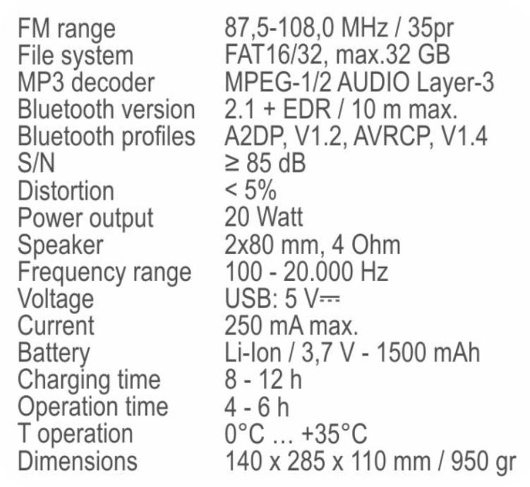 Ugrađena punjiva baterija 1200 mAh, vrijeme punjenja 3 h, reprodukcija do 3 h.