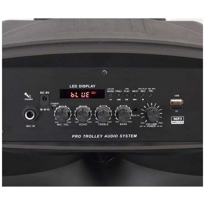 Prenosivi multimedijalni zvučnik sa daljinskim upravljačem, LED svjetlosni efekti, digitalni crveni LED display, bežična BT TWS veza, slušanje glazbe sa mobilnog uređaja, računara, MP3 reprodukcija sa USB / microSD uređaja, mogučnost snimanja na na USB / microSD uređaj (opcionalno), KARAOKE i kontrola eho-a mikrofona, FM radio sa automatskim traženjem postaja, 6,3 mm priključak za mikrofon, 3,5 mm AUX audio ulaz, ugrađena baterija sa automatskim punjenjem, očekivano vrijeme punjenja / rada: ~ 7,5 h / ~ 16 h, dizajnirano za rad baterije, lagan, kompaktan, prenosiv dizajn, ručka za nošenje na izvlačenje i kotačići za lakše kretanje kretanje, 2-smjerni bas refleks, 300 mm subwoofer, 60 W, Dimenzije 340 x 540 x 280 mm. Može se montirati na postolje ∅35mm (opcija: HT 900).Napajanje daljinskog upravljača dugmasta baterija CR 2025 (3V), Pribor daljinski upravljač, napojni adapter