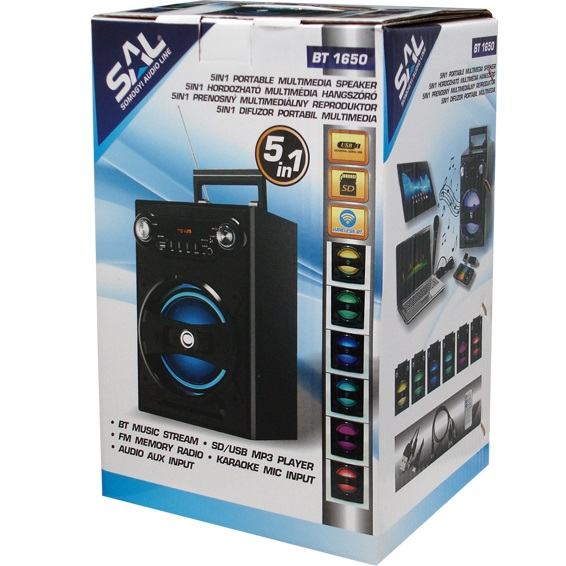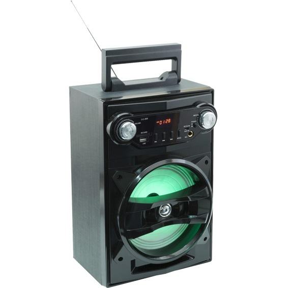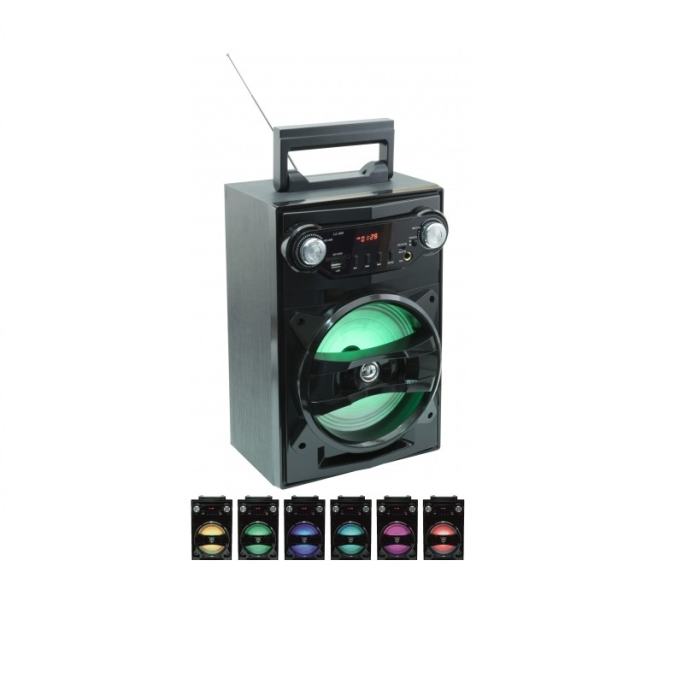 Prenosivi multimedijalni zvučnik sa daljinskim upravljačem, 5in1, pojačalo snage 25W, Bluetooth, ugrađen FM radio sa automatskim traženjem stanica, opseg 87,0 - 108,0 MHz, MP3 player, reprodukcija sa USB-a , SD memorijska kartica, AUX ulaz, MIC ulaz 6,3mm, Bluetooth spajanje sa Smartphone-om - Handsfree, KARAOKE, LED display sa promjenjivim pozadinskim osvjetljenjem, LED diode koje mijenjaju boju, EQ postavke. Ugrađena Li-Ion baterija. Materijal izrade , drvena kutija sa ručkom za nošenje.